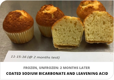 We determined that the best option for the chef was a blend of coated sodium bicarbonate and coated leavening acid – and recommended that the coated leavening blend be added to the dry mix and dry blended for a few seconds before being added to the wet ingredients (over-blending or using paddles would erode the coating on the active particles).